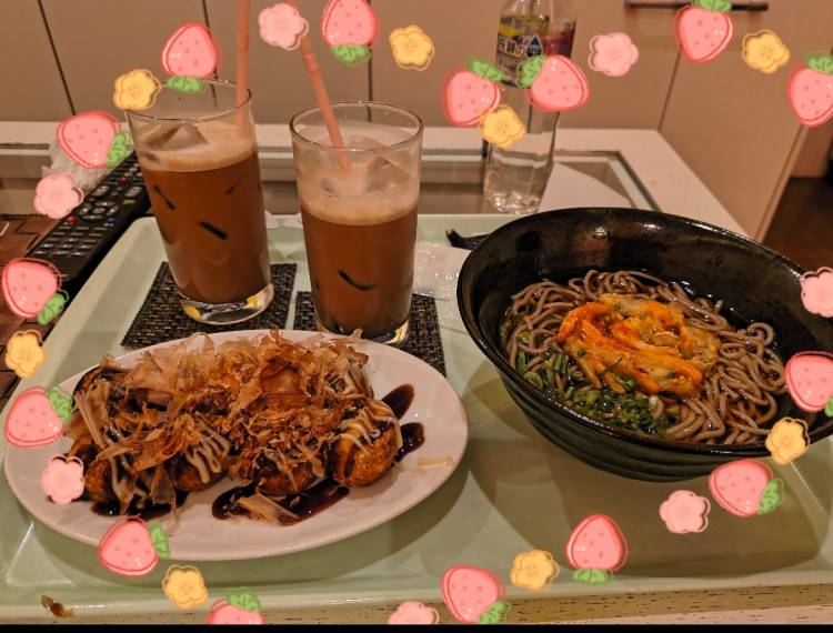 今日もお腹減ったからお蕎麦とたこ焼きを注文ー