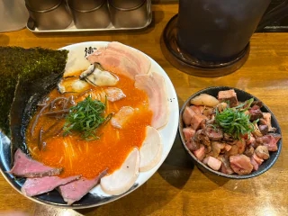 直球で!!美味すぎます!!旨辛らーめん🍜うますぎます!!お兄さんみんなに食べて欲しいの!!ってくらい美味しすぎるの!あ、でも辛いの苦手な方はやめた方がいいかもな、そうゆう人は醤油ラーメンおすすめ!あと和牛の方選んでね!!牡蠣トッピングはマストだしミニ肉丼はもっとマストです🦪ぜひ食べてみてね!