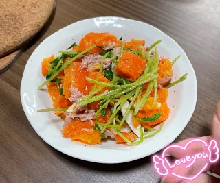 人参と豆苗とゆで卵とツナを和えました🍽️💕