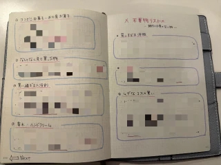 あとゎ年始にも書いたウィッシュリストの制作に、毎年去年の家計簿アプリやスケジュール帳のメモを見て書き出す"不要物洗い出し"