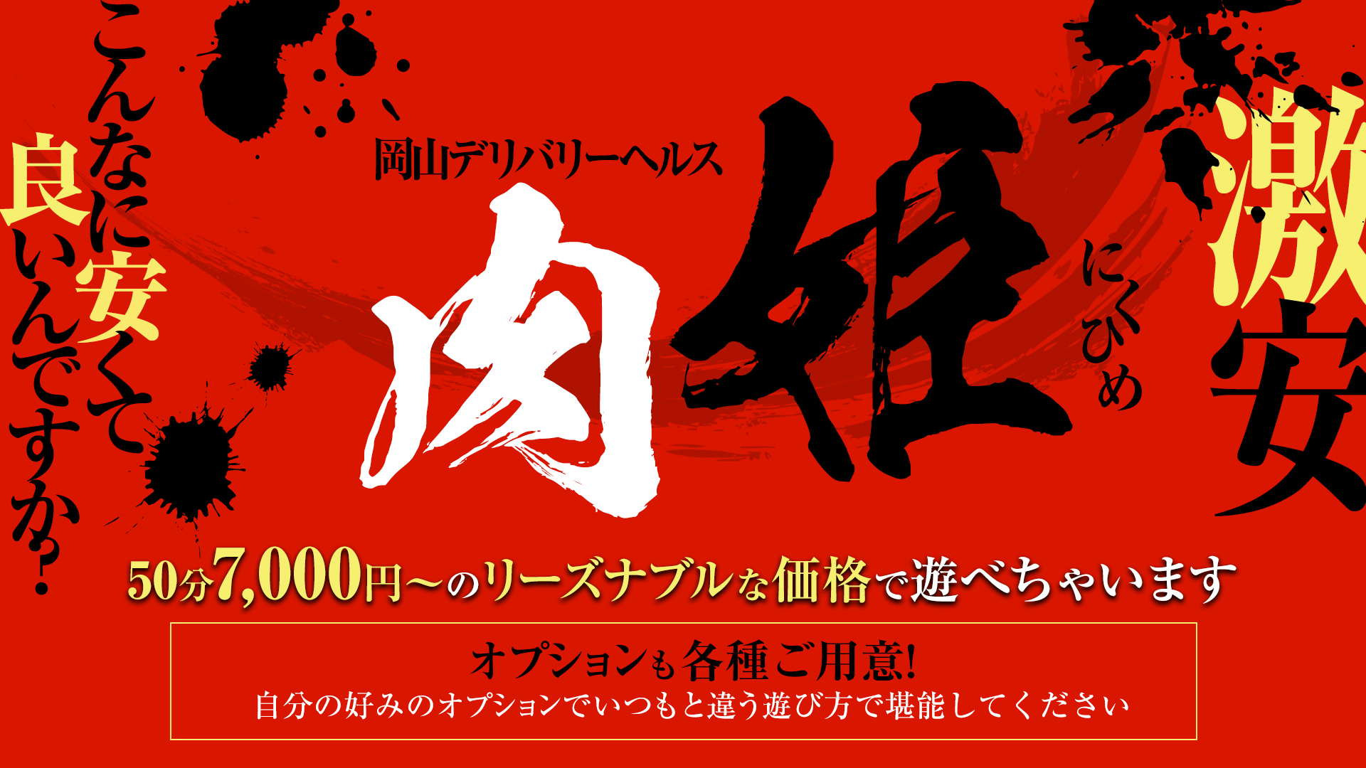 清楚系、スレンダー、爆乳の女の子まで色んなジャンルの女性が50分7000円~のリーズナブルな価格で遊べちゃいます。 オプションも各種ご用意!自分の好みのオプションでいつもと違う遊び方も出来ます!?