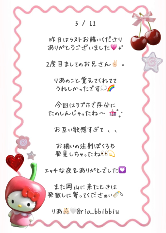 TOP ★秘密の出会いから始まる官能の 在籍スタッフ 本日出勤表(週間) 今すぐイケる娘 写メ日記 動画 リアルタイム速報 求人 料金システム 口コミ ランキング グラビア メルマガ 必読注意事項 テスト 求人マンガ ランキング アンダー割 岡山市/デリヘル RANKAN-ランカン- 営業時間:[受付9:15〜]10:00~翌2:00 定休日:不定休 電話番号:080-8237-8751 TOP ★秘密の出会いから始まる官能の 在籍スタッフ 本日出勤表(週間) 今すぐいける娘 写メ日記 動画 リアルタイム速報 求人 料金システム 口コミ ランキング グラビア メルマガ 必読注意事項 テスト 求人マンガ ランキング アンダー割 りあ この女の子をフォローする RANKAN-ランカン- 出勤予定 11:00~02:00 写メ 可愛い系 ロリ系 美少女系 美乳 敏感体質 プロフィール 写メ日記 口コミ 日付で見る 2026年03月 日 月 火 水 木 金 土 1 2 3 4 5 6 7 8 9 10 11 12 13 14 15 16 17 18 19 20 21 22 23 24 25 26 27 28 29 30 31 ゆかし201のリピさま?? 26/03/12 12:30 女の子とお店をフォローします いいね! ? 女の子とお店をフォローします いいね! この日記をXに投稿する この女の子の口コミを書く ログインメールアドレス パスワード ログイン状態を保持する 無料会員登録 × 閉じる この女の子をフォローする 1つ新しい日記へ 1つ前の過去の日記へ りあの写メ日記一覧へ戻る 前の女の子 次の女の子 0人がこちらの女の子を検討中です ログインをしてもっとお得にネット予約 ログインID パスワード ログイン状態を保持する 無料会員登録 SNS会員様はこちらからログインしてください 閉じる × いいね!するにはログインが必要です いいね!すると女の子にあなたが いいねしたことが伝わります 女の子とお店を自動的にフォロー するのでアクセスが簡単になります ログイン 初めてのご利用ですか? 会員登録(無料)はこちら