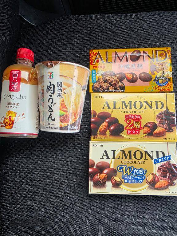 アーモンドチョコ3種類にゴンチャのミルクティにセブンの肉うどんまで買ってきてくれて