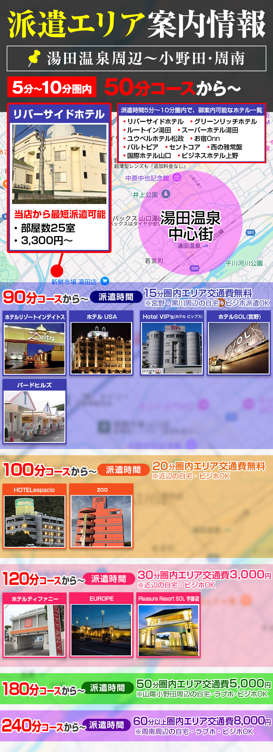 「湯田周辺エリア限定」で50分(40分)〜ご案内とさせていただきます