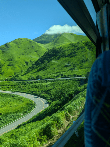 フェリーから下船、何百人も乗ってたけど、別府湾から黒川温泉や熊本方面に行くのは私のみ。我が道を行く(*^^*)(笑)バスからの綺麗な景色🌲🌲