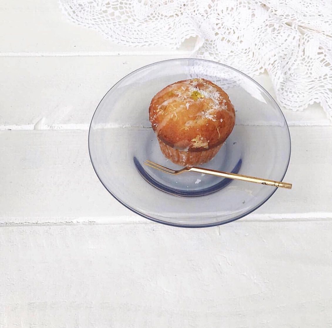 前にガラスで作ったケーキ皿