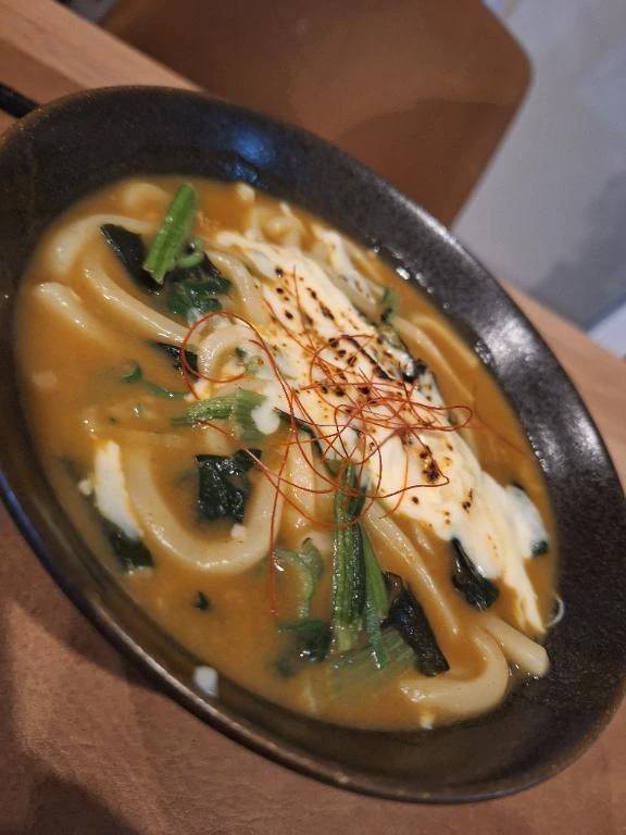 市販の冷凍うどんにほうれん草とチーズとワカメを入れて、アレンジしてみた簡単なもの。