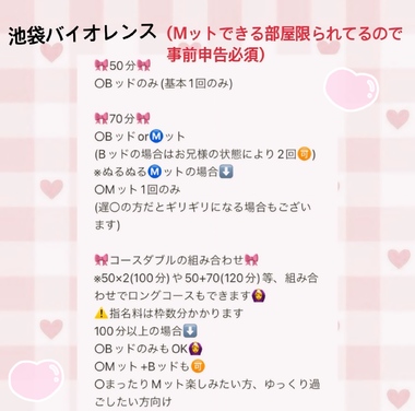 ○池袋でⓂ️ット希望の場合は70分から🉑で、できるお部屋も限られてるので基本⚠️事前申告必須⚠️になります🙇♀️