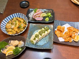 夜行ったごはん屋さんが超超ちょ〜〜〜美味しくて!!!海鮮もお肉も何頼んでも美味しかったからみてみて♪( ◜ω◝و(و