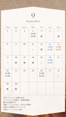 【9月の出勤予定】