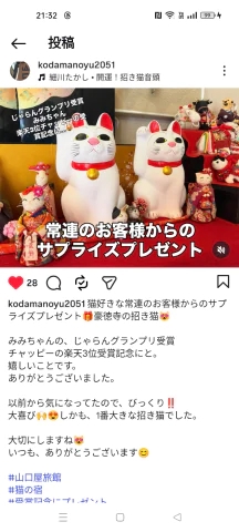 の受賞祝いに豪徳寺の招き猫(特大)を女将と社長にプレゼントしたのを女将がインスタのストーリーとかにアップしてくれた笑😻✨