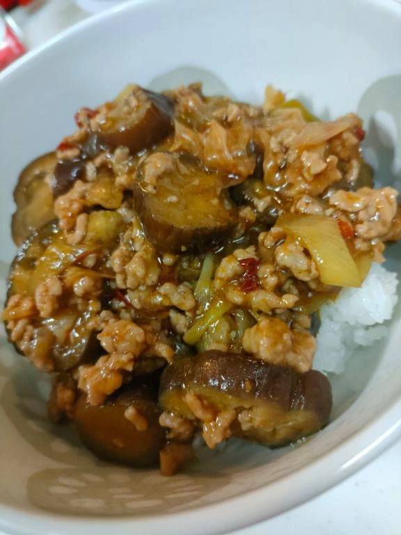 ゴマ油で炒めたピリ辛麻婆茄子丼