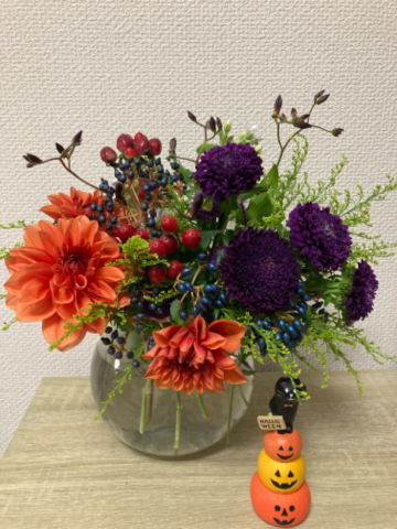 少しハロウィンぽく生けてみましたよ?