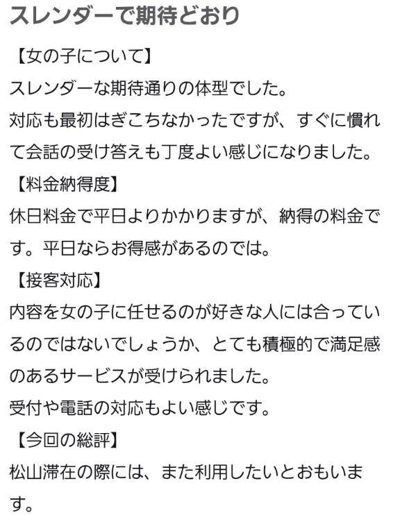 TOP リニューアルオープン 在籍スタッフ 出勤表 今すぐイケる娘 写メ日記 リアルタイム速報 求人 料金システム 口コミ ネット予約 メルマガ キャンペーン 必読注意事項 アクセスマップ アンダー割 松山・道後/ソープ タレント 営業時間:10:00~23:59 電話番号:089-945-7275 住 所:愛媛県松山市道後多幸町6番23号 TOP リニューアルオープン 在籍スタッフ 出勤表 今すぐいける娘 写メ日記 リアルタイム速報 求人 料金システム 口コミ ネット予約 メルマガ キャンペーン 必読注意事項 アクセスマップ アンダー割 えな この女の子をフォローする タレント 写メ プロフィール 写メ日記 口コミ 日付で見る 2026年02月 日 月 火 水 木 金 土 1 2 3 4 5 6 7 8 9 10 11 12 13 14 15 16 17 18 19 20 21 22 23 24 25 26 27 28 ありがとう🩷 26/02/08 14:51 女の子とお店をフォローします いいね! 口コミ投稿ありがとうございます😊お兄様にえなのスレンダー気に入ってもらえて嬉しいです🥰️最初はな緊張しちゃったけど話していくうちに仲良くなれて嬉しい♥️えなの御奉仕喜んでもらえて嬉しい😳💕 女の子とお店をフォローします いいね! この日記をXに投稿する この女の子の口コミを書く ログインメールアドレス パスワード ログイン状態を保持する 無料会員登録 × 閉じる この女の子をフォローする 1つ新しい日記へ 1つ前の過去の日記へ えなの写メ日記一覧へ戻る 前の女の子 次の女の子 0人がこちらの女の子を検討中です ログインをしてもっとお得にネット予約 ログインID パスワード ログイン状態を保持する 無料会員登録 SNS会員様はこちらからログインしてください 閉じる × いいね!するにはログインが必要です いいね!すると女の子にあなたが いいねしたことが伝わります 女の子とお店を自動的にフォロー するのでアクセスが簡単になります ログイン 初めてのご利用ですか? 会員登録(無料)はこちら