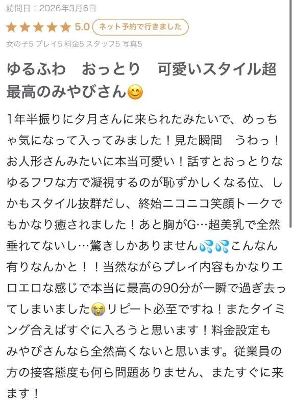TOP 🎊新イベント☔️ 雨の日は《夕月DAY》開催中!☔️💗 ★女の子一覧 出勤表 今すぐイケる娘 写メ日記 リアルタイム速報 求人 料金システム 口コミ メルマガ キャンペーン 必読注意事項 アクセスマップ アンダー割 松山・道後/ソープ 夕月 営業時間:8:00~23:59(23:00受付終了) 電話番号:089-993-6885 住 所:松山市道後湯之町16-22 TOP 🎊新イベント☔️ 雨の日は《夕月DAY》開催中!☔️💗 ★女の子一覧 出勤表 今すぐいける娘 写メ日記 リアルタイム速報 求人 料金システム 口コミ メルマガ キャンペーン 必読注意事項 アクセスマップ アンダー割 みやび この女の子をフォローする 夕月 出勤予定 08:00~23:30 待機中 写メ プロフィール 写メ日記 口コミ 日付で見る 2026年03月 日 月 火 水 木 金 土 1 2 3 4 5 6 7 8 9 10 11 12 13 14 15 16 17 18 19 20 21 22 23 24 25 26 27 28 29 30 31 【お礼写メ日記】 26/03/07 19:02 女の子とお店をフォローします いいね! ㊗️☆5🎉来てくれてありがとうございました!!なかなか指名しないのに動画みて決めたって言ってもらえてすごく嬉しかったです🥰たくさん頑張って私の事気持ちよくさせてくれてありがとう💕また待ってます🎶 女の子とお店をフォローします いいね! この日記をXに投稿する この女の子の口コミを書く ログインメールアドレス パスワード ログイン状態を保持する 無料会員登録 × 閉じる この女の子をフォローする 1つ新しい日記へ 1つ前の過去の日記へ みやびの写メ日記一覧へ戻る 前の女の子 次の女の子 5人がこちらの女の子を検討中です ログインをしてもっとお得にネット予約 ログインID パスワード ログイン状態を保持する 無料会員登録 SNS会員様はこちらからログインしてください 閉じる × いいね!するにはログインが必要です いいね!すると女の子にあなたが いいねしたことが伝わります 女の子とお店を自動的にフォロー するのでアクセスが簡単になります ログイン 初めてのご利用ですか? 会員登録(無料)はこちら