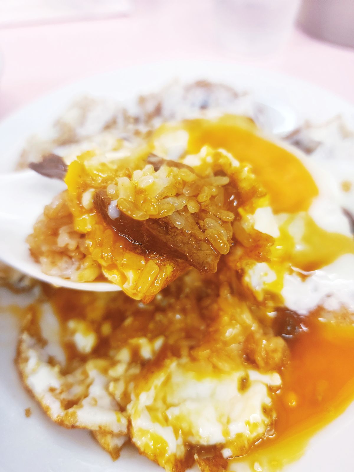 黄身を崩して焼豚とタレを