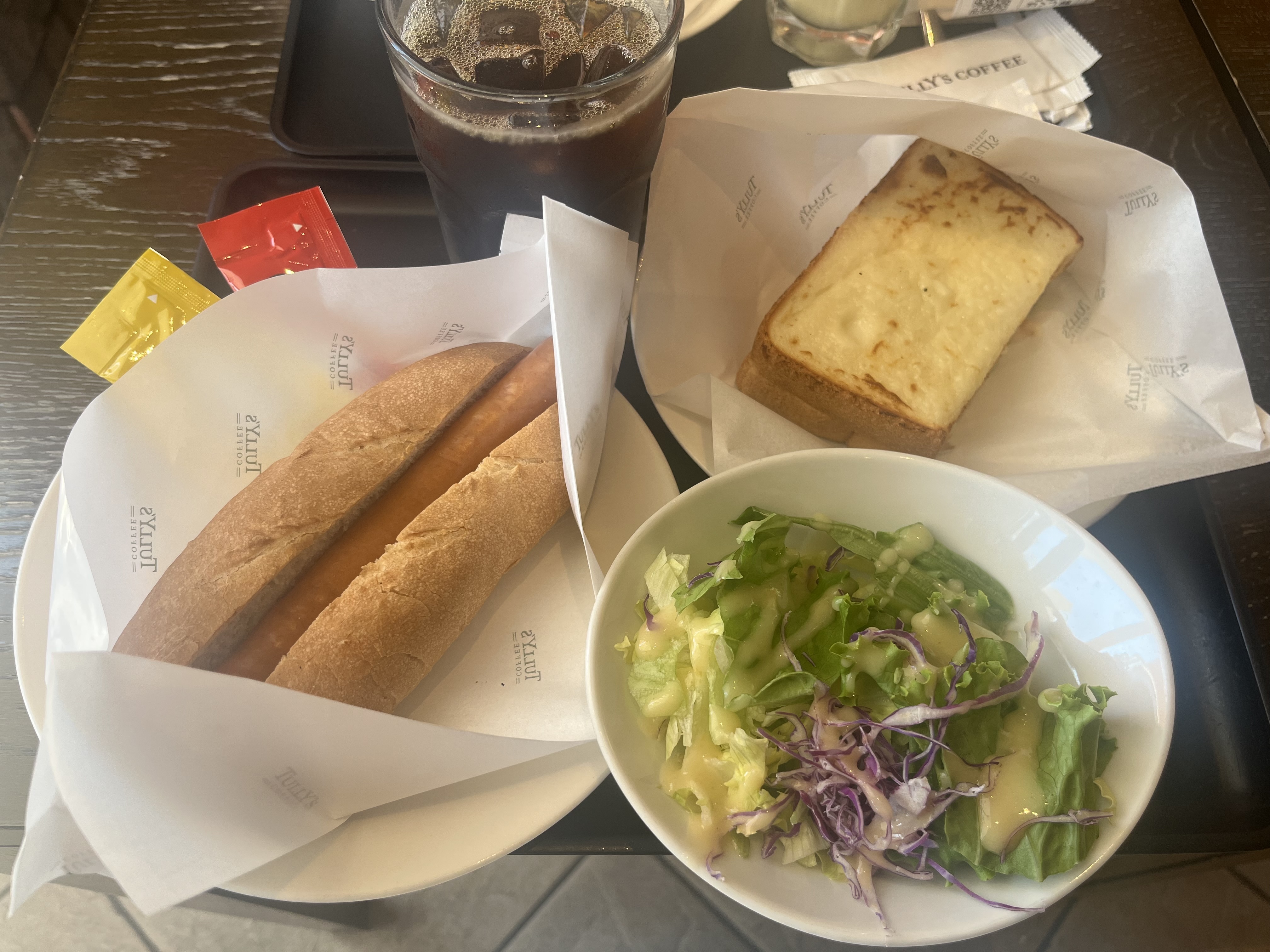 微妙な時間だったので、お昼兼用にし、ホットサンドのセットと単品でサラダとホットドッグも付けました😋🌭